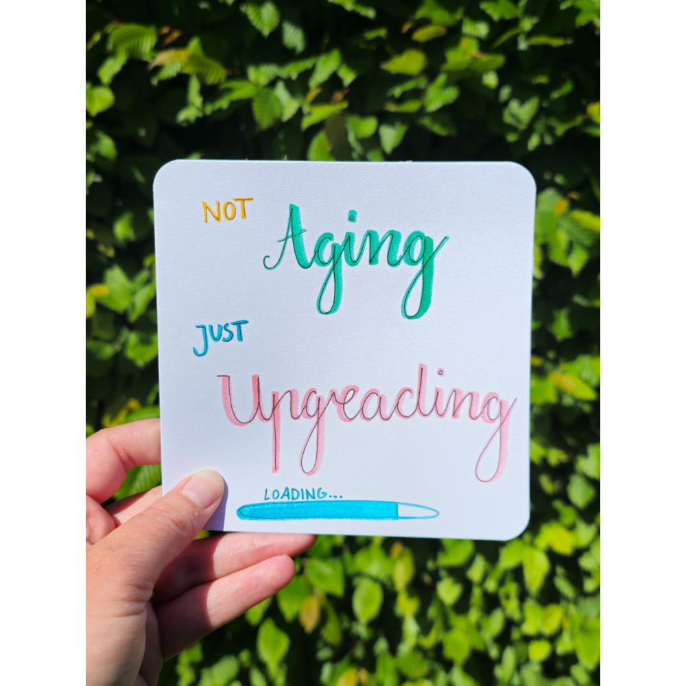 Handgemaakte wenskaart met de tekst: "Not aging, just upgrading"